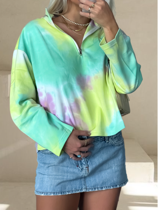 Bundle up for the cooler weather with this super cute tie dye sweater, paired with some vintage denim jeans and sneakers for the perfect outfit. Fit/Detailing: True to size V Neckline Quarter-zip 100% Cotton Model Details: Dress size: NZ 6/8 US 2/4 Top Size: M Height: 172cm